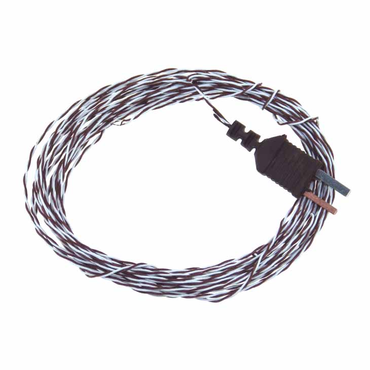 TA01-V T Type Fine Wire Probe. This sensor is constructed using PTFE wire constructed as a flat pair. The wire used is 1/2 Class 1 Type T alloys (Cu/Co). A weld bead is manufactured at one end of the wire whilst the other end is terminated in a moulded miniature thermocouple plug. This probe is available in various lengths up to 20 meters. Used for applications such as air, liquid or surface temperatures
